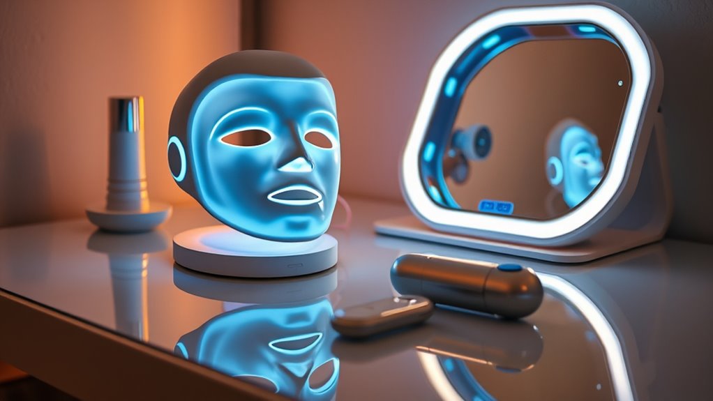 Beauty tech gadgets like LED masks, smart mirrors, and sonic cleansing tools are transforming your skincare routine. These devices use advanced technology, such as light therapy, AI analysis, and microcurrents, to deliver professional-level results at home. They’re convenient, personalized, and often easy to use daily. As innovative trends grow, future devices will become even smarter and more accessible. Keep exploring to discover how these cutting-edge tools can elevate your beauty journey.