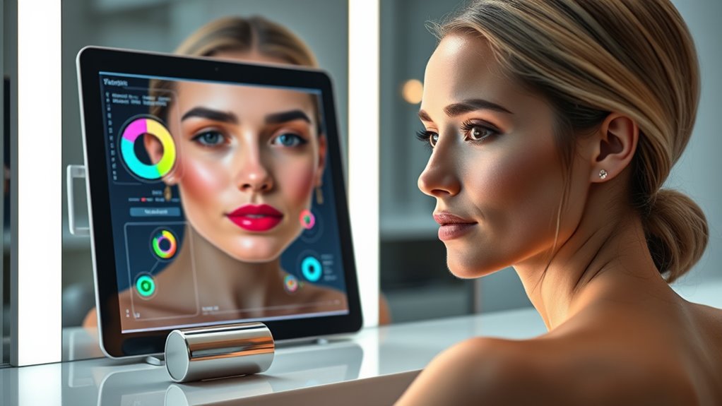 Data-driven algorithms analyze vast amounts of personal skincare information to deliver highly accurate product recommendations. You’re matched with products that directly address your skin concerns, whether it’s reducing wrinkles, controlling oil, or brightening dark spots. By cross-referencing your skin data with dermatology and ingredient databases, AI guarantees that each suggestion is scientifically supported and tailored specifically to you. Virtual try-ons and smart mirrors allow you to test products in real time, confirming compatibility before purchase. AI chatbots guide you through options, reducing guesswork and preventing mismatched products. This accurate matching process minimizes waste, saves you money, and boosts results, making your skincare routine more effective and personalized than ever before.