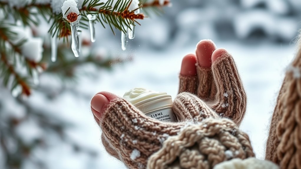 To protect your skin in cold weather, choose gentle, oil-based cleansers that remove dirt without stripping moisture. Keep your skin hydrated with rich creams containing ceramides, hyaluronic acid, and occlusives like petrolatum. Cover up with scarves and gloves, and always wear broad-spectrum sunscreen outdoors. Avoid hot showers and harsh exfoliants to prevent dryness, and use targeted treatments for conditions like eczema or psoriasis. Want to discover more tips to keep your skin resilient? Keep exploring how winter skincare can work for you.