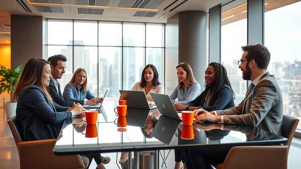You can demonstrate measurable ROI by tracking key metrics like application rates, quality of candidates, and employee retention linked to branding efforts. Use data analytics to connect branding initiatives with improved hiring efficiency, lower costs, and higher employee engagement. Regularly report on these KPIs to show how your employer brand impacts business outcomes, proving its value and justifying ongoing investment in branding strategies.