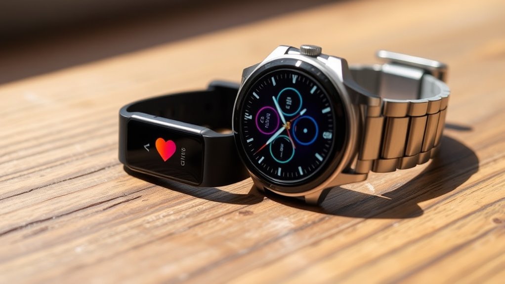 Tracking capabilities and fitness features are at the core of both fitness trackers and smartwatches, but they serve different levels of detail and accuracy. Fitness trackers excel at basic metrics like steps, heart rate, sleep, and calories burned, often providing consistent, long-lasting data for everyday wellness. They use specialized sensors to deliver reliable insights, especially for athletes or dedicated health monitoring. Smartwatches go further, offering advanced health metrics such as ECG, heart rate variability, skin temperature, and fall detection. They support multiple fitness apps, allowing you to customize workouts and access detailed analyses. While both devices track your activity, fitness trackers focus on simplicity and endurance, whereas smartwatches provide exhaustive fitness data alongside broader smart features. Additionally, reliable sensors play a crucial role in ensuring the accuracy of these health metrics across both devices.