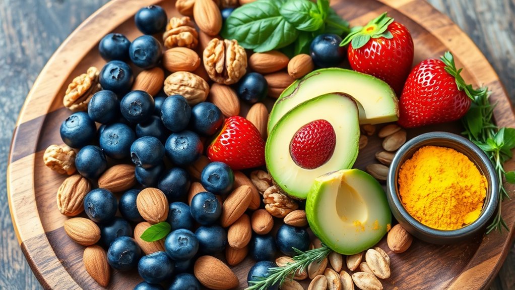 To support your cognitive health, focus on eating nutrient-rich foods like fruits, vegetables, whole grains, and fatty fish such as salmon, which provide essential antioxidants, omega-3s, and vitamins that protect neurons and improve brain function. Incorporate healthy fats from olive oil and nuts, and prioritize lifestyle habits like regular exercise, adequate sleep, and social engagement. Keep exploring to discover more practical ways to boost your brainpower and maintain mental resilience over time.