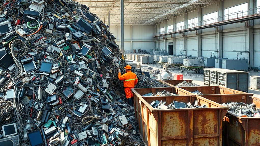 Most of the world’s e-waste ends up in informal recycling sectors, where practices are often unsafe and unregulated. You might not realize that in these environments, workers manually dismantle devices without protective gear, exposing themselves and communities to toxic chemicals like lead, mercury, and arsenic. These informal methods lack proper safety standards, leading to environmental contamination and health risks. Because of limited oversight, valuable materials like gold, copper, and rare earth elements are frequently discarded or improperly recovered, wasting resources. This dominance of informal recycling persists partly because of inadequate infrastructure, high costs, and weak enforcement of regulations. Additionally, the absence of regulatory frameworks means these unsafe practices continue unchecked, causing long-term environmental damage and health hazards for vulnerable populations.