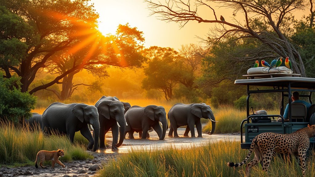 Safari adventures are a powerful driver of economic growth, generating billions of dollars annually through tourism revenue. You directly benefit from this industry by supporting local businesses, lodges, and guides, which rely heavily on safari tourism. These activities create over 9 million jobs worldwide, providing income for communities near protected areas. As a traveler, your participation helps fund conservation projects and habitat preservation efforts. Protected areas generate hundreds of billions each year, with tourism dollars fueling infrastructure improvements and local development. The expanding market, projected to reach USD 316.2 billion by 2033, offers new opportunities for investment and sustainable enterprise. Your safari experience not only delivers adventure but also contributes considerably to the economies of host countries, fostering economic resilience and encouraging ongoing conservation efforts. Additionally, fostering active listening and empathy can enhance your understanding of conservation issues and the importance of protecting these ecosystems for future generations.