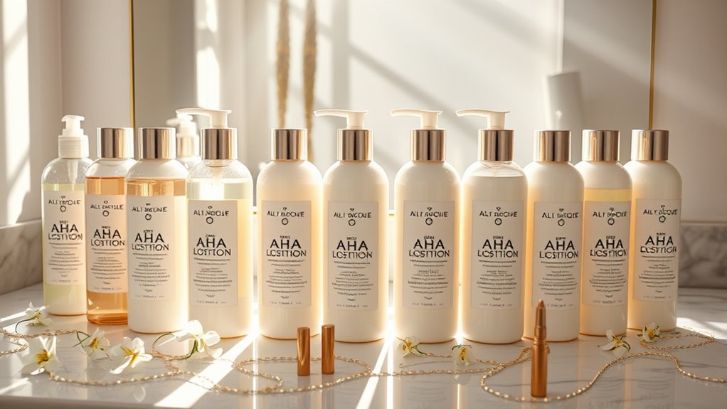 If you’re looking to boost your skin’s glow, I recommend trying some of the top body lotions with AHA, like those with glycolic, lactic, or fruit-derived acids. These formulas exfoliate dead skin, improve texture, and brighten your overall look. Many contain hydrating ingredients too, so your skin stays soft. If you want to discover the best options and how to use them effectively, there’s more you should know.