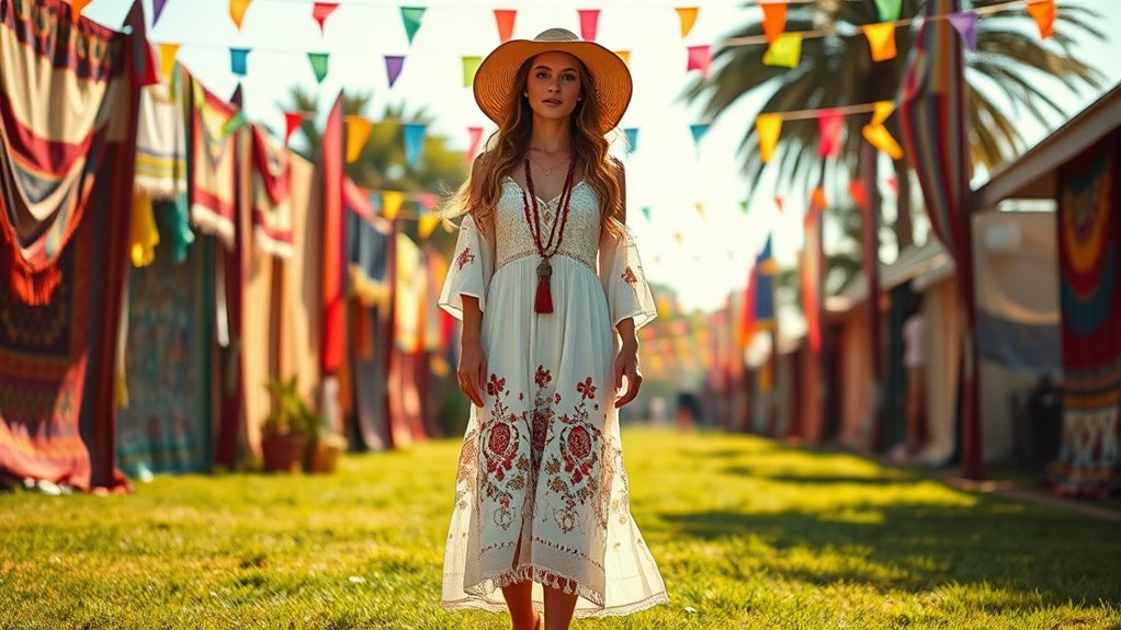 Your personal style should be the foundation of your boho festival outfit, guiding you to feel confident and authentic throughout the event. Incorporate elements like fringe, floral prints, or layered jewelry to express who you are. Mixing vintage-inspired pieces with modern trends creates a unique look that truly stands out. Think about your preferred color palette and textures to guarantee your outfit feels cohesive and comfortable. Adding statement accessories, such as head chains or bohemian necklaces, can elevate your entire look and showcase your personal flair. Ultimately, your outfit should reflect your personality and make you feel empowered. Trust your instincts and choose pieces that resonate with you—this authenticity will shine through and make your festival experience unforgettable.