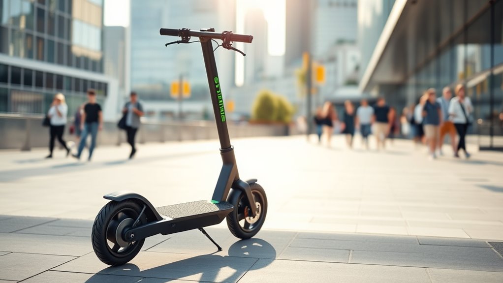 Safety and braking are critical factors to contemplate when selecting an electric scooter for daily commuting. Reliable stopping power is essential, so look for models with dual braking systems, like electronic and mechanical brakes, which work together for maximum safety. An anti-lock braking system (EABS) can prevent wheel lock-up during sudden stops, helping you stay stable and in control. Certification matters too—UL 2272 ensures the scooter meets strict electrical safety standards, reducing fire and failure risks. Good visibility is crucial, so opt for bright headlights, taillights, and reflectors, especially for night rides. Finally, regular maintenance of brakes and safety checks are key to ongoing performance and rider safety, ensuring your scooter remains reliable in all conditions.