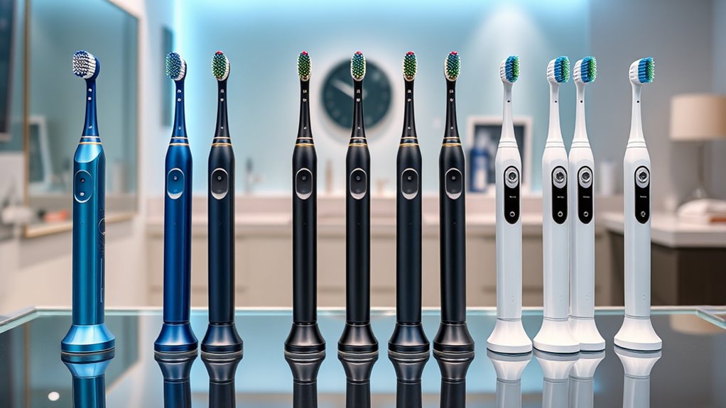 Choosing an electric toothbrush with user-friendly features can make daily brushing more effective and less frustrating. Look for models with built-in timers, such as 2-minute SmartTimers, to help you brush for the dentist-recommended duration. Quadrant timers that alert every 30 seconds encourage even cleaning across all mouth areas. Opt for toothbrushes with simple, intuitive controls and modes, making them accessible for users of all ages and skill levels. An ergonomic handle ensures a comfortable grip and easy maneuvering, especially during longer brushing sessions. Additionally, features like pressure sensors or replacement reminders—whether visual or auditory—enhance safety and guarantee ideal use. These ease of use features simplify your routine and promote better oral health with less hassle.