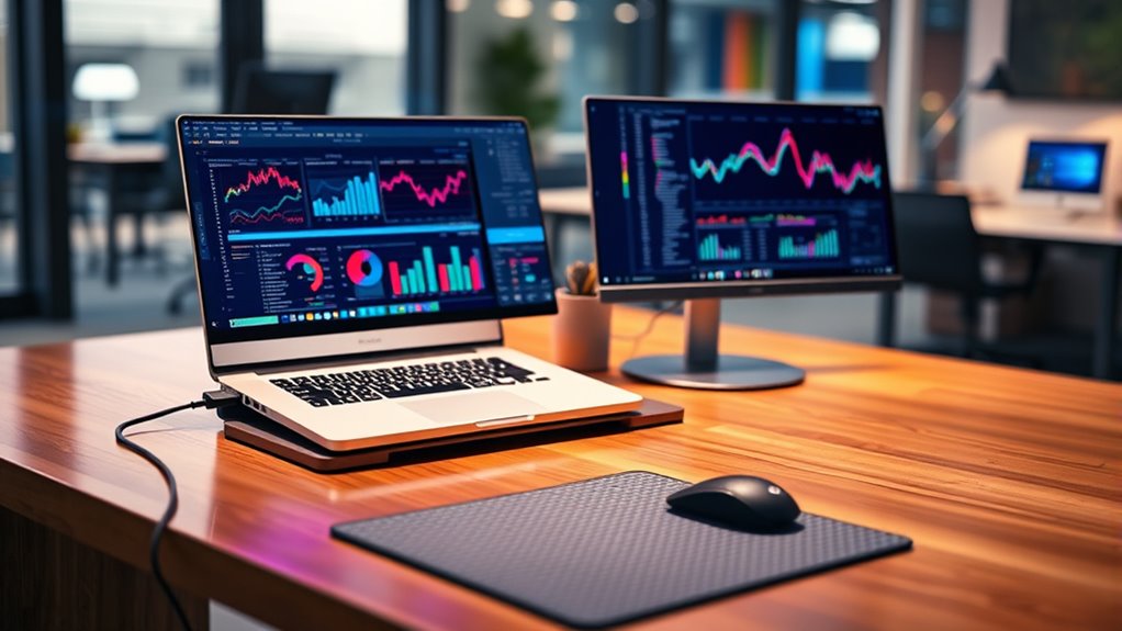 Choosing a docking station with the right display output capabilities is essential for a seamless dual monitor setup. You need to guarantee it supports your desired resolution, like 4K at 60Hz, for crisp visuals. Check if it offers mirror mode, extend mode, or both, depending on your workflow and OS compatibility. Multiple video outputs, such as HDMI, DisplayPort, or VGA, are important to match your monitors’ connection types. Also, verify if the station supports high refresh rates—60Hz or higher at your preferred resolution—to keep motion smooth and lag minimal. Keep in mind that some docking stations may limit MacOS to mirror mode, while Windows systems typically support extended displays. Prioritizing these output features guarantees a flexible, high-quality dual monitor experience.