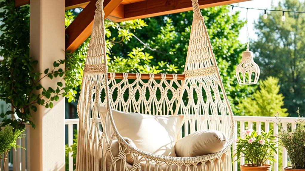 When deciding where to place your macramé hammock chair, it’s important to regard whether it’ll be used indoors or outdoors. Outdoor models are made from weather-resistant materials like treated cotton or synthetic fibers, designed to withstand UV rays, moisture, and temperature changes. They often feature sturdy hardware and frames built for durability in varying conditions. Indoors, chairs typically focus on aesthetics and comfort, with soft cushions and intricate designs, but lack weatherproofing. If you choose outdoor use, consider your climate and whether additional covers or protective features are necessary to prolong the chair’s life. Conversely, indoor chairs excel in style and plush comfort, making them ideal for protected spaces. Matching your choice to your environment guarantees longevity and enjoyment.