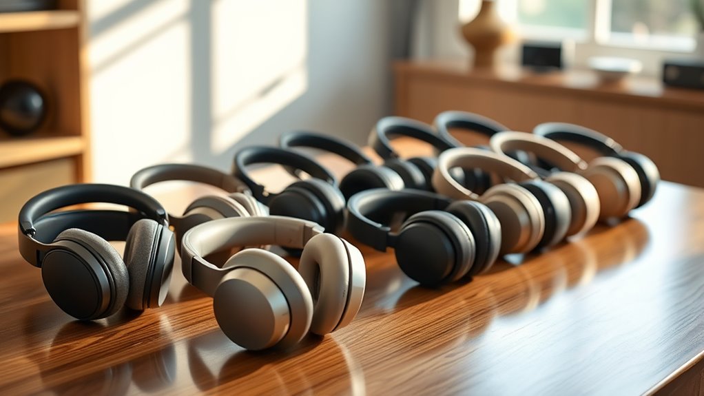 Achieving exceptional sound quality is the top priority when choosing over-ear Bluetooth headphones, as it directly impacts your listening experience. I look for headphones with large drivers, typically 40mm or more, to deliver clear vocals and deep bass. Hi-Res audio certification and support for lossless wired connections guarantee the highest fidelity. Customizable sound profiles, through multiple EQ settings or sound modes, let me tailor audio to different genres or moods. Balanced sound reproduction is vital, so vocals, instruments, and bass aren’t muffled or overpowered. Advanced drivers, like silk diaphragms and optimized tuning, create immersive, premium audio. Prioritizing these factors guarantees an authentic, rich listening experience whether I’m relaxing, working, or enjoying music on the go.
