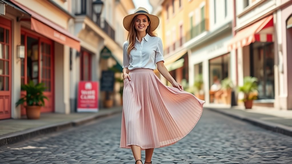 To style pleated midi skirts for different seasons, I layer thoughtfully. In winter, I pair them with cozy sweaters, tights, and ankle boots to stay warm. During spring and summer, I opt for lightweight tops, sandals, or sneakers for a breezy vibe. Fall calls for chunky sweaters and boots. Mixing textures and accessories keeps the look fresh, no matter the season.