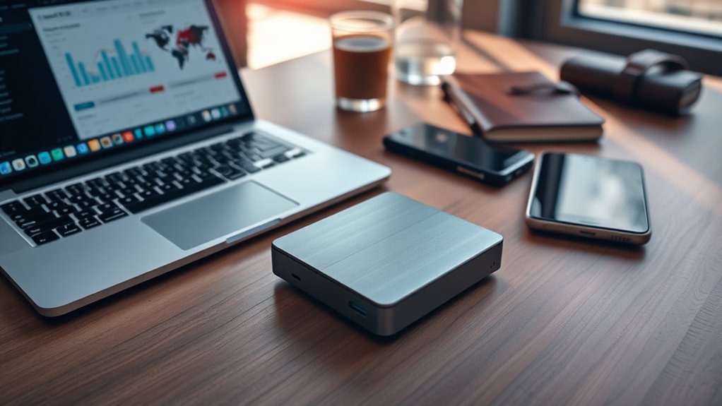 Think of a portable SSD as a brave knight on a treacherous journey—its durability standards are like armor. Most business travel SSDs meet military-grade standards like MIL-STD-810G, ensuring they withstand shocks, drops, and extreme conditions. I look for devices with IP ratings such as IP67 or IP68, which guarantee water and dust resistance. These standards give me confidence that my data stays safe, no matter where my travels take me.