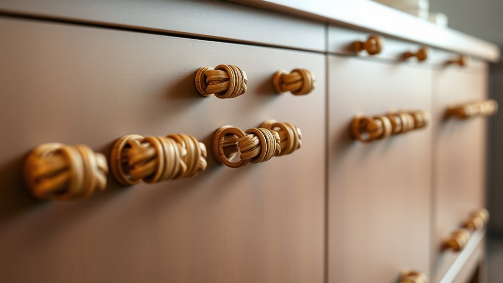 If you want to upgrade your kitchen with a warm, bohemian, or rustic charm, I recommend exploring rattan cabinet pulls. These stylish handles come in various designs like woven rattan, twisted jute rope, and handcrafted wood, perfect for adding texture and character. They’re easy to install and suit different decor styles, from coastal to vintage. Keep in mind size, material, and compatibility, and you’ll find the perfect fit. If you’re curious, there’s more to discover that can transform your space even further.