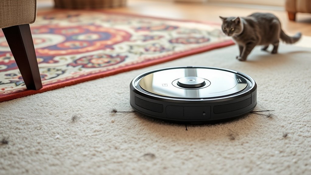 Battery runtime duration plays a key role in how effectively a robot vacuum can handle pet hair across your home. Longer battery life means it can clean larger areas continuously, reducing the need for frequent recharges. Most pet-friendly models offer between 60 to 120 minutes of operation per charge, depending on suction power and cleaning mode. High-capacity batteries or fast-charging features can extend cleaning sessions and cut down downtime. Shorter battery life may require multiple recharges, especially in bigger or multi-room homes, which can interrupt your cleaning routine. For homes with high pet hair buildup, choosing a vacuum with a longer runtime is essential for efficient, uninterrupted cleaning. It ensures your space stays clean without constant recharging, saving you time and effort.