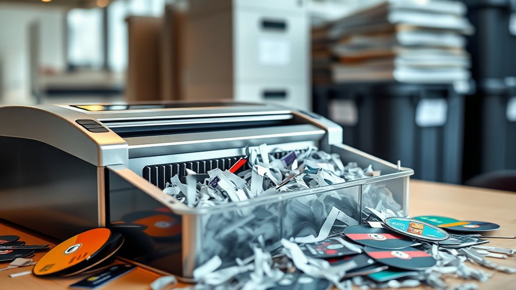 Choosing a shredder that makes disposal simple involves considering features like a large-capacity waste bin or pull-out drawer, which reduces the need for frequent emptying. Transparent windows on bins let me quickly see when it’s full, preventing messes. I also prefer models that support continuous operation with longer run times, so I can shred multiple credit cards or CDs without interruption. Features like automatic shut-off and overload protection help me avoid jams and make disposal smoother. A user-friendly design with simple controls and clear indicators ensures I can dispose of shredded media quickly and without hassle. Overall, these features make maintenance easier, saving me time and effort while keeping my shredding process efficient and secure.