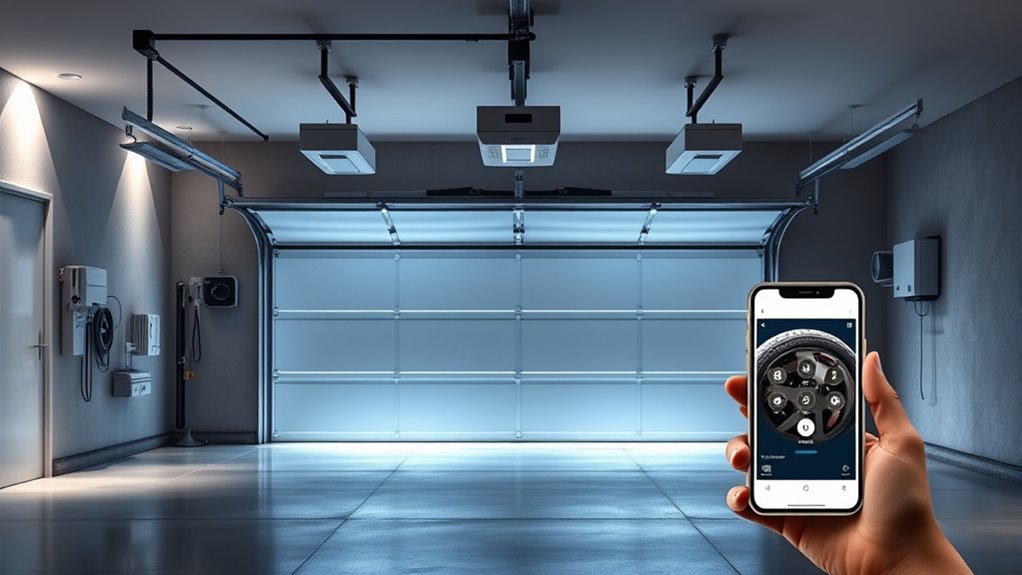 Choosing a smart garage door opener with the right connectivity and app features is essential for a seamless user experience. You want an app that works smoothly with your preferred devices, whether iOS or Android, so controlling your garage is effortless. It should provide real-time status updates, alerts, and activity logs, allowing you to monitor your garage remotely. Check that it supports reliable connectivity options like Wi-Fi or Bluetooth, and that it’s compatible with your home’s Wi-Fi frequencies (2.4 GHz or 5 GHz). Features like scheduling automatic closing, remote operation, and virtual keys enhance convenience and security. Additionally, integration with smart home systems like Alexa, Google Assistant, or Apple HomeKit enables voice control and automation, making your smart garage smarter and more responsive.