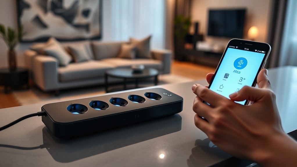 When selecting a smart power strip, guaranteeing it integrates smoothly with Alexa for voice control makes managing devices much easier. I look for models that support hands-free operation through Alexa, allowing me to turn outlets on or off with simple voice commands. Compatibility with the Alexa app is vital, as it lets me control outlets individually or in groups, creating routines that automate my devices. I also prefer devices that offer app control for remote management, scheduling, and automation, especially when I’m away from home. Clear instructions for linking the power strip to Alexa are essential, along with multiple control options like voice commands and smartphone apps. This ensures seamless, flexible control, making my home smarter and more convenient.