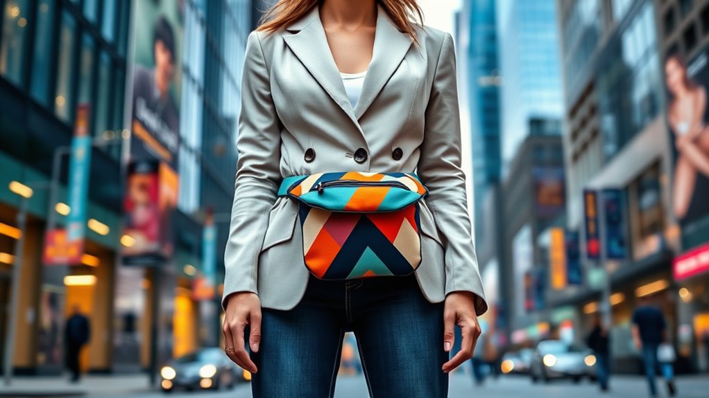 When choosing a trendy belt bag, I look for security features like hidden zippers, RFID-blocking pockets, and sturdy clasps. These details help prevent pickpocketing and protect my cards and valuables. I also prefer bags with secure closures and reinforced stitching to guarantee durability. Combining style with these security features gives me peace of mind without sacrificing fashion, making my outings safer and more convenient.