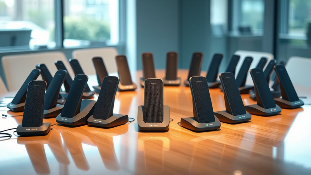 USB speakerphones generally plug directly into my computer or device, making integration seamless across platforms like Zoom, Teams, or Skype. I just connect the device via USB, and it’s automatically recognized, often with minimal setup. Most speakerphones are compatible with multiple conferencing apps, so I don’t need to install special drivers. This universal compatibility guarantees clear audio for all my meetings, no matter which platform I’m using.